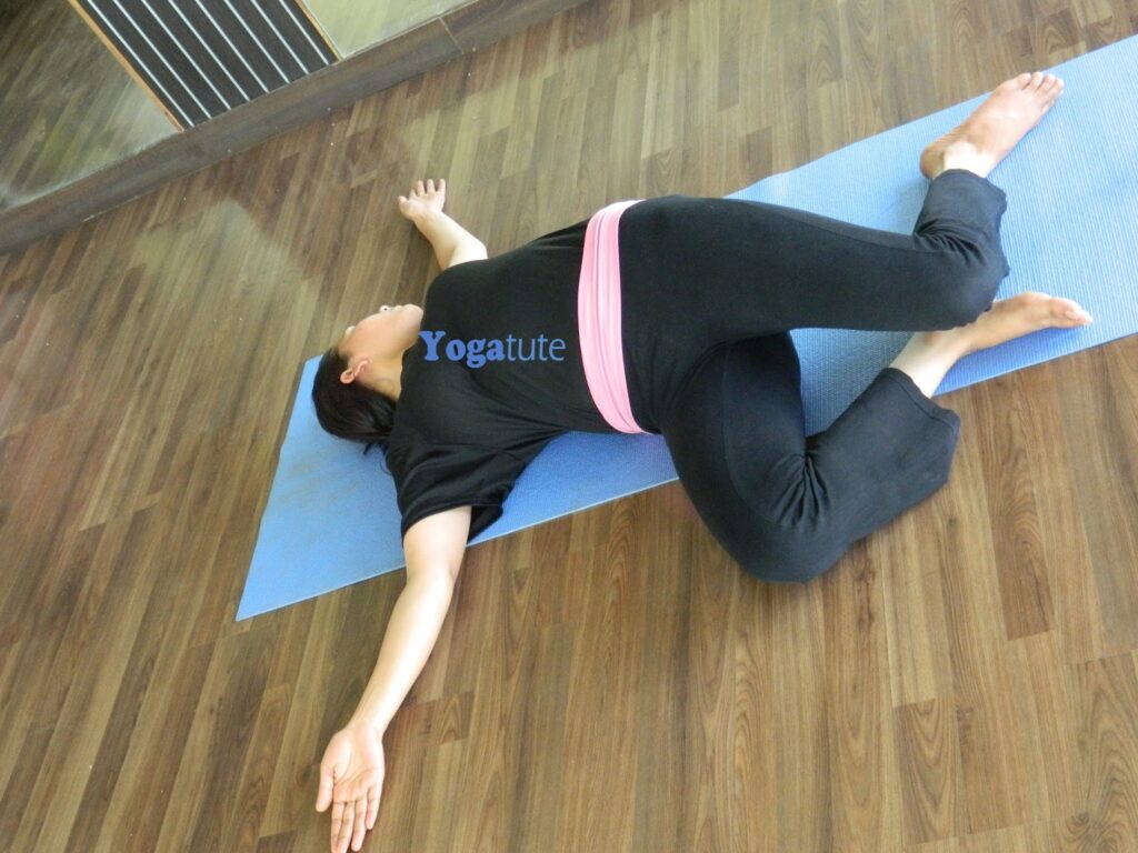 इसके बाद दोनों पैर के घुटने को दाहिनी तरफ फर्श से लगा देंगे या क्रिया 4 से 5 सेकंड तक ऐसे ही फर्श पर स्पर्श रखेंगे