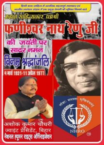 फणीश्वर नाथ रेणु का जन्म 4 मार्च 1921 को औराडी हिंगन्ना, जिला पूर्णियां, बिहार में हुआ। आप आजीवन शोषण और दमन के विरूद्ध संधर्षरत रहे। इसी प्रसंग में सोशलिस्ट पार्टी से जा जुड़े व राजनीति में सक्रिय भागीदारी की। 1942 के भारत-छोड़ो आंन्दोलन में सक्रिय भाग लिया। 1950 में नेपाली दमनकारी रणसत्ता के विरूद्ध सशस्त्र क्रांति के सूत्रधार रहे। 1954 में ‘मैला आँचल’ उपन्यास प्रकाशित हुआ तत्पश्चात् हिन्दी के कथाकार के रूप में अभूतपूर्व प्रतिष्ठा मिली। जे० पी० आन्दोलन में सक्रिय भागीदारी की और सत्ता द्वारा दमन के विरोध में पद्मश्री का त्याग कर दिया। हिन्दी आंचलिक कथा लेखन में सर्वश्रेष्ठ।
